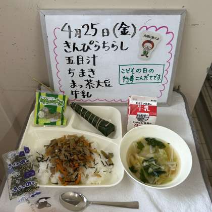 今日の給食は、こどもの日の行事食で『きんぴらちらし、五目汁、ちまき、まっ茶大豆、牛乳』でした。
