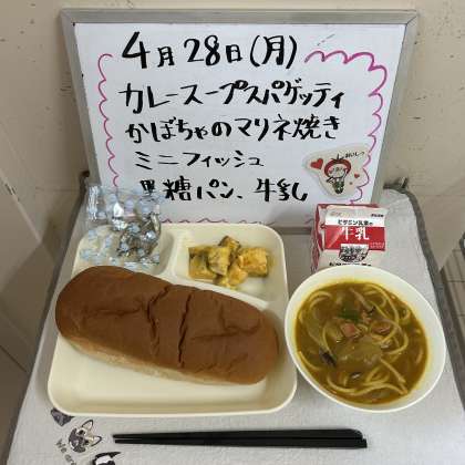 今日の給食の献立は『カレースープスパゲッティ、かぼちゃのマリネ焼き、ミニフィッシュ、黒糖パン、牛乳』でした。
