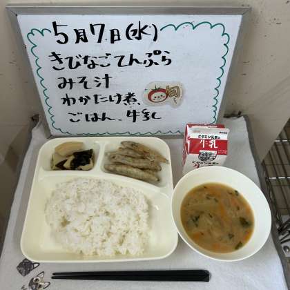 今日の給食の献立は『きびなごてんぷら、みそ汁、わかたけ煮、ごはん、牛乳』でした。