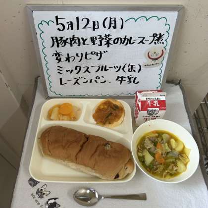 今日の給食の献立は『豚肉と野菜のカレースープ煮、変わりピザ、ミックスフルーツ(缶)、レーズンパン、牛乳』でした。