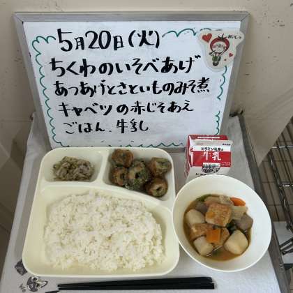 今日の給食の献立は『ちくわのいそべあげ、あつあげとさといものみそ煮、キャベツの赤じそあえ、ごはん、牛乳』でした。