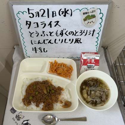 今日の給食の献立は『タコライス、とうふともずくのとろり汁、にんじんしりしり風、牛乳』でした。