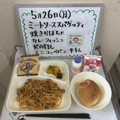 今日の給食の献立は『ミートソーススパゲッティ、焼きかぼちゃ、カレーフィッシュ、発酵乳、ミニコッペパン、牛乳』でした。