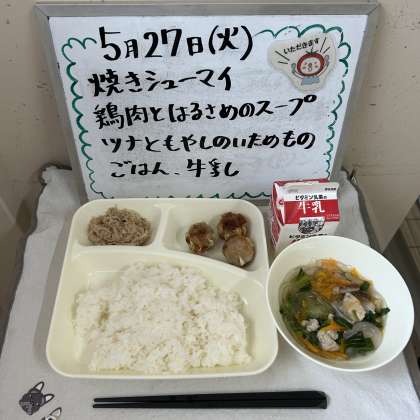 今日の給食の献立は『焼きシューマイ、鶏肉とはるさめのスープ、ツナともやしのいためもの、ごはん、牛乳』でした。