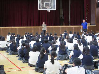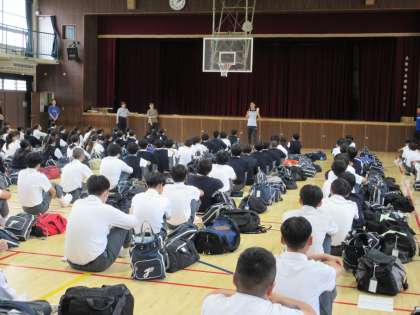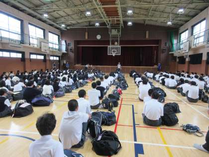 明日から実施される修学旅行に向けて、5限目に体育館で、3日間の概略の行程確認や荷物(持ち物)の確認を行いました。