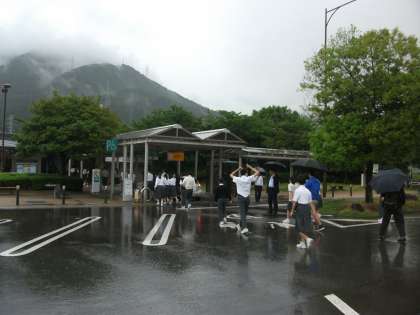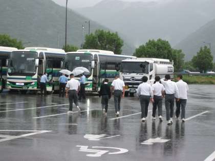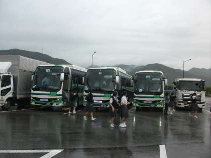 トイレ休憩をすませた後で、雨天のためバスの中で昼食となります。