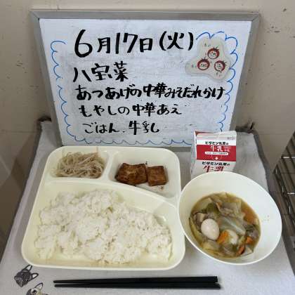 今日の給食の献立は『八宝菜、あつあげの中華みそだれかけ、もやしの中華あえ、ごはん、牛乳』でした。