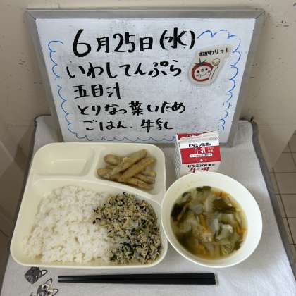 今日の給食の献立は『いわしてんぷら、五目汁、とりなっ葉いため、ごはん、牛乳』でした。