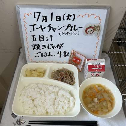 今日の給食の献立は『ゴーヤチャンプル、五目汁、焼きじゃが、ごはん、牛乳』でした。