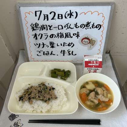 今日の給食の献立は『鶏肉と一口がんもの煮もの、オクラの梅風味、ツナつ葉いため、ごはん、牛乳』でした。