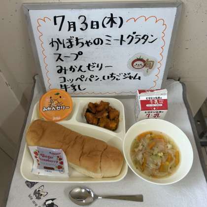 今日の給食の献立は『かぼちゃのミートグラタン、スープ、みかんゼリー、コッペパン、いちごジャム、牛乳』でした。