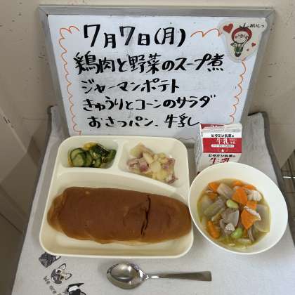 今日の給食の献立は『鶏肉と野菜のスープ煮、ジャーマンポテト、きゅうりとコーンのサラダ、おさつパン、牛乳』でした。