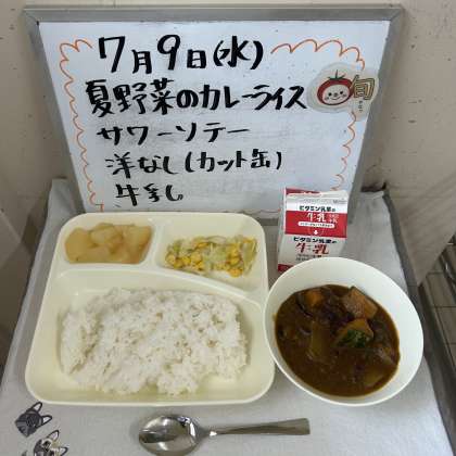 今日の給食の献立は『夏野菜のカレーライス、サワーソテー、洋なし(カット缶)、牛乳』でした。