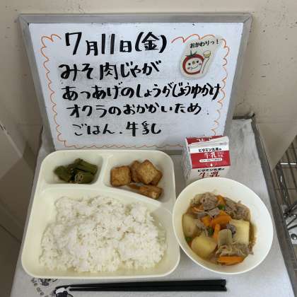 今日の給食の献立は『みそ肉じゃが、あつあげのしょうがじょうゆかけ、オクラのおかかいため、ごはん、牛乳』でした。