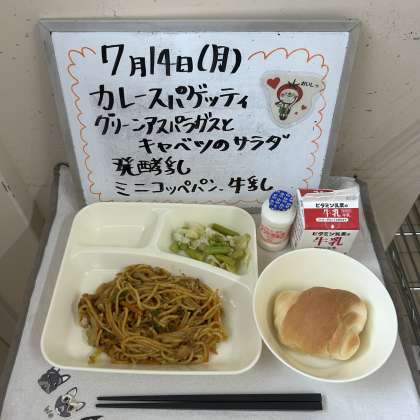 今日の給食の献立は『カレースパゲッティ、グリーンアスパラガスとキャベツのサラダ、発酵乳、ミニコッペパン、牛乳』でした。