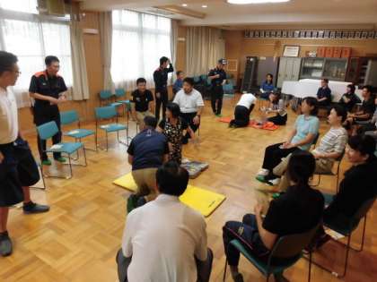 参加者全員が、実際に人形を使い胸部圧迫・AED操作の研修を受けました。