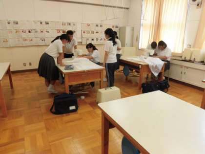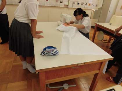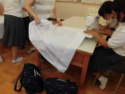 まず、布をミシンで縫う作業を放課後の時間を使い家庭科室で行っていました。