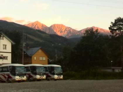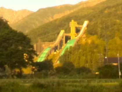 修学旅行、二日目です。今日も快晴です。朝方は、気温が15度ぐらいで肌寒い感じがします。朝焼けの山の風景がきれいです。近くに、長野ジャンプ台があります。
