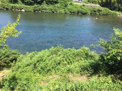 これからラフティングです。天候は快晴です。ラフティング日和で、水も透明感があり、魚も見れるとのことです。写真は長良川のきれいな流れです。川底が見えます。