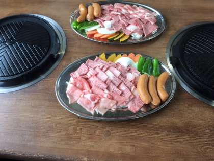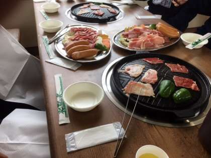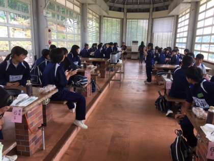 班別体験が終わり、牧歌の里で全員集合しバーベキューの昼食をすませました。天候は、昼から小雨です。