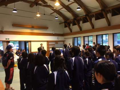民泊を行うグリンパーク吉峰に到着し、入村式を行いました。ゆるキャラ「らいじい」の出迎えを受けました。その後、生徒のみなさんは、各民泊へ別れて行きました。