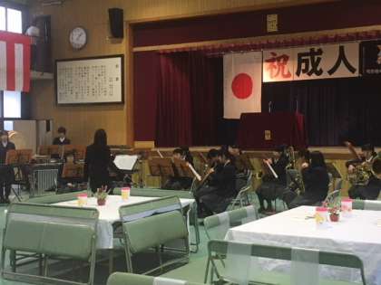 1月8日、鴫野小学校で、鴫野地域成人式の式典に吹奏楽部が出席し、演奏を新成人の皆さんに披露しました。