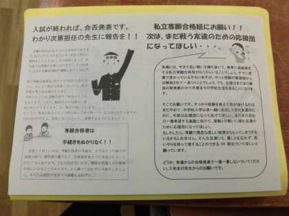 プリントを使って、受験の心構え等の話が担任の先生よりありました。