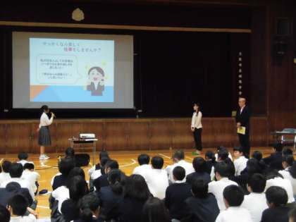 職業安定所の方からは、ハローワークの役割の話、企業の方からは、なぜこの会社に入社したかなどを自分の体験を基に話していただきました。生徒の皆さんは、真剣に聞いていました。