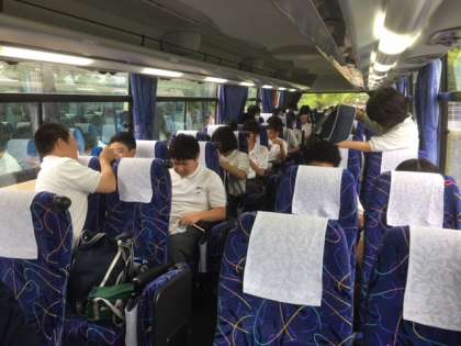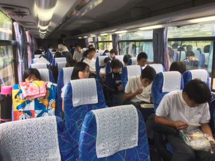 飯田運動公園に到着して、昼食です。小雨のため、バスの中での食事です。