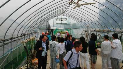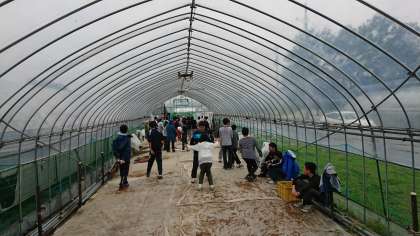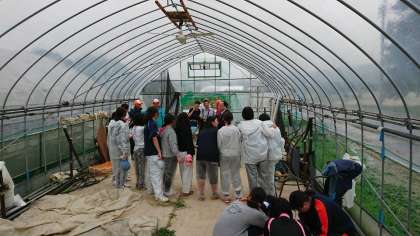 民泊ごとに分かれて、農家体験です。このグループは、ビニールハウスの中での作業でした。
