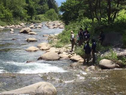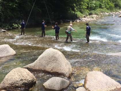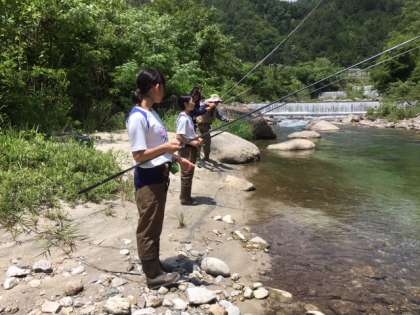 グループ別アクティビティ、渓流釣りです。川中に入って釣っています。釣果は、お楽しみに!