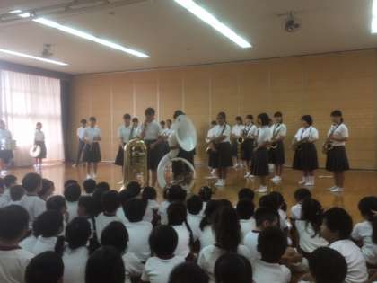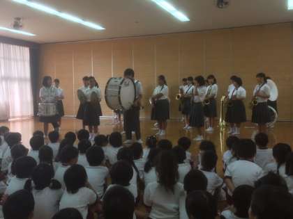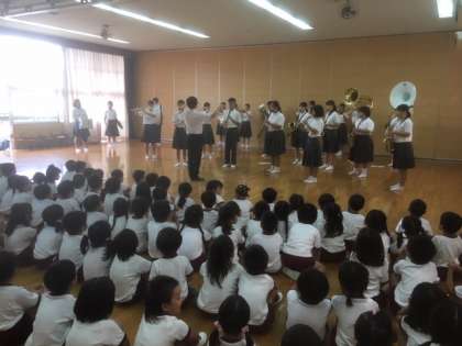 6日、毎年恒例になっている城東幼稚園運動会での行進曲演奏ですが、雨天の為、運動会が延期になり、行進曲演奏ができませんでした。そこで、今年は、室内で幼稚園児に演奏を披露しました。途中、生徒から楽器の説明もあり、盛り上がりました。