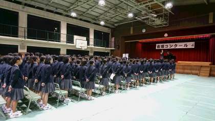 はじめに、課題曲を学年全体で合唱しました。 写真上