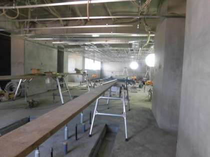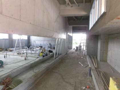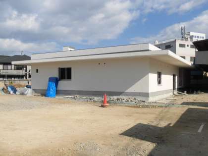 給食棟工事の写真です。外壁工事もほぼ終了しました。