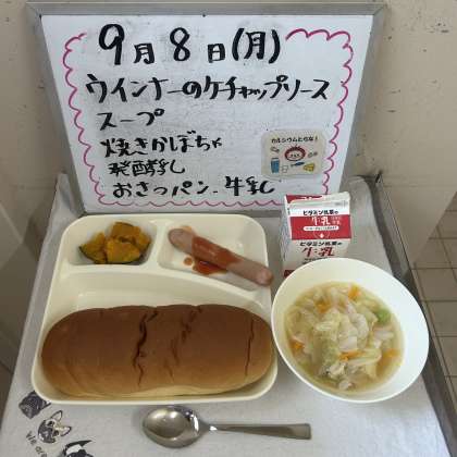 今日の給食の献立は『ウインナーのケチャップソース、スープ、焼きかぼちゃ、発酵乳、おさつパン、牛乳』でした。
