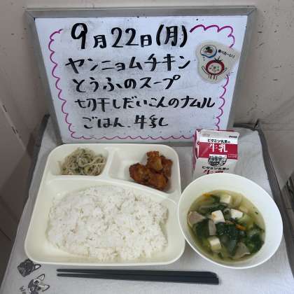 今日の給食の献立は『ヤンニョムチキン、とうふのスープ、切干しだいこんのナムル、ごはん、牛乳』でした。