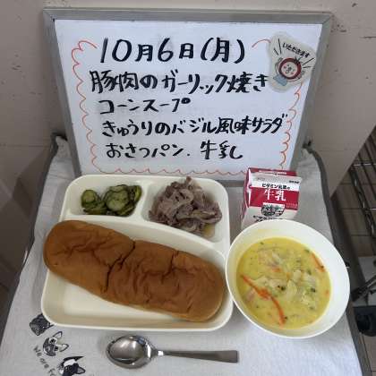 今日の給食の献立は『豚肉のガーリック焼き、コーンスープ、きゅうりのバジル風味サラダ、おさつパン、牛乳』でした。