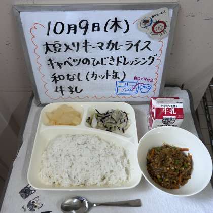 今日の給食の献立は『大豆入りキーマカレーライス、キャベツのひじきドレッシング、和なし(カット缶)、牛乳』でした。