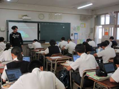 本日、2限目に2年1組において、社会科の築地先生の研究授業を行いました。