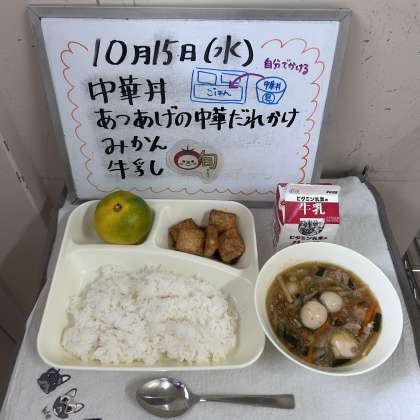 今日の給食の献立は『中華丼、あつあげの中華だれかけ、みかん、牛乳』でした。