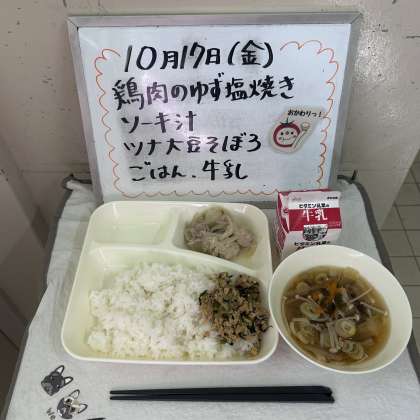今日の給食の献立は『鶏肉のゆず塩焼き、ソーキ汁、ツナ大豆そぼろ、ごはん、牛乳』でした。
