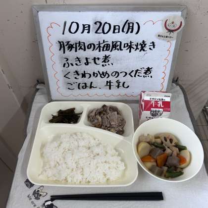 今日の給食の献立は『豚肉の梅風味焼き、ふきよせ煮、くきわかめのつくだ煮、ごはん、牛乳』でした。