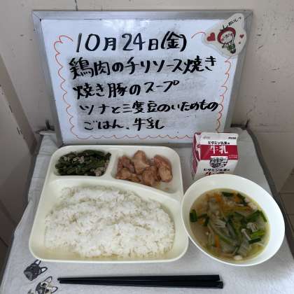 今日の給食の献立は『鶏肉のチリソース焼き、焼き豚のスープ、ツナと三度豆のいためもの、ごはん、牛乳』でした。