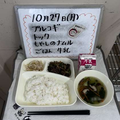 今日の給食の献立は『プルコギ、トック、もやしのナムル、ごはん、牛乳』でした。