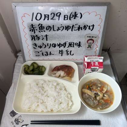 今日の給食の献立は『赤魚のしょうゆだれかけ、豚汁、きゅうりのゆず風味、ごはん、牛乳』でした。