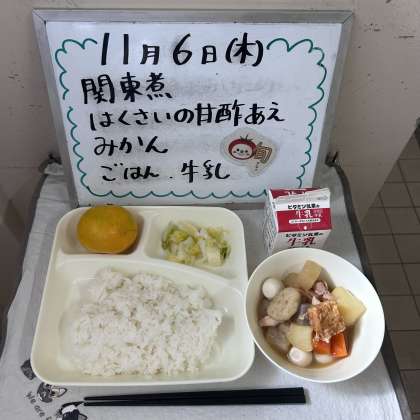 今日の給食の献立は『関東煮、はくさいの甘酢あえ、みかん、ごはん、牛乳』でした。