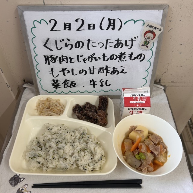 今日の給食の献立は『くじらのたつたあげ、豚肉とじゃがいもの煮もの、もやしの甘酢あえ、菜飯、牛乳』でした。