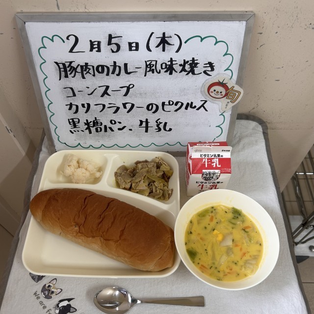 今日の給食の献立は『豚肉のカレー風味焼き、コーンスープ、カリフラワーのピクルス、黒糖パン、牛乳』でした。