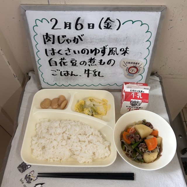 今日の給食の献立は『肉じゃが、はくさいのゆず風味、白花豆の煮もの、ごはん、牛乳』でした。