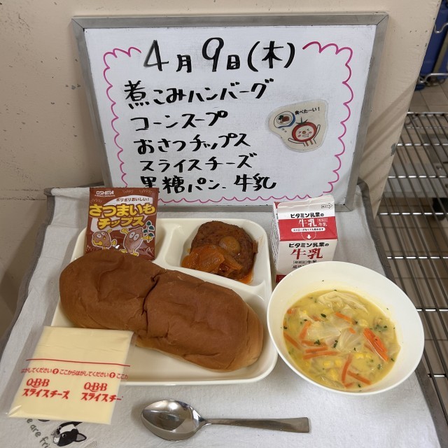 今日の給食の献立は『煮こみハンバーグ、コーンスープ、おさつチップス、スライスチーズ、黒糖パン、牛乳』でした。